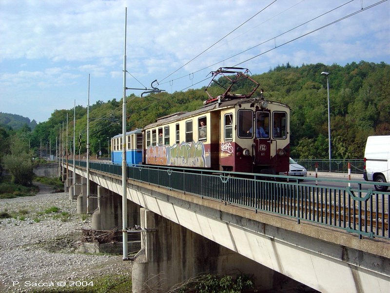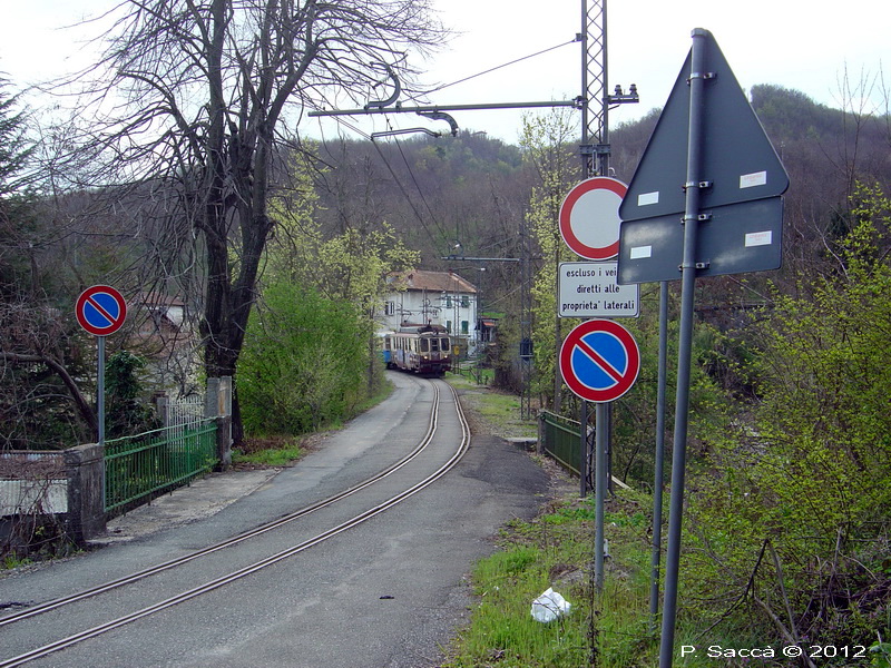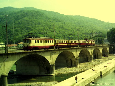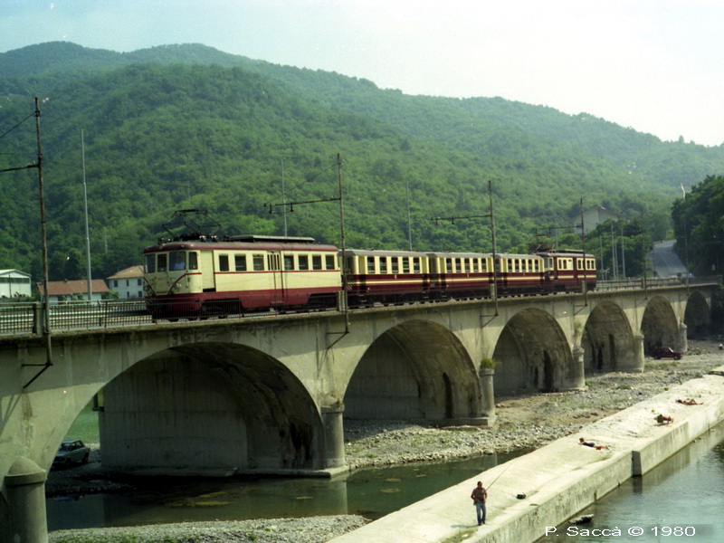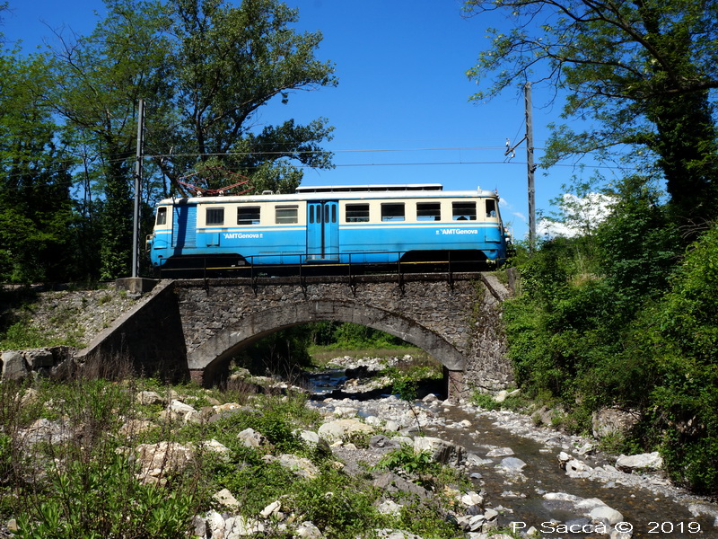 | Sopra: ( 3 ) - Ponte Km 23+866 sullo Scrivia tra Casella Deposito e Casella Paese. Dal 1952 al 1980 binario in sede stradale promiscua sino alla stazione di Casella Paese e dal 1980 in sede propria fino al capolinea. | |||||